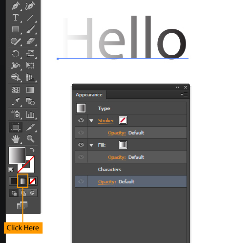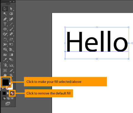 Write your new text, and then click on it with the Selection Tool to select it. Look at your colour fill square (shown bottom left in the screenprint below), and if necessary click on it to select it and bring it above. Then click the No Fill button as shown below to remove the default Fill.