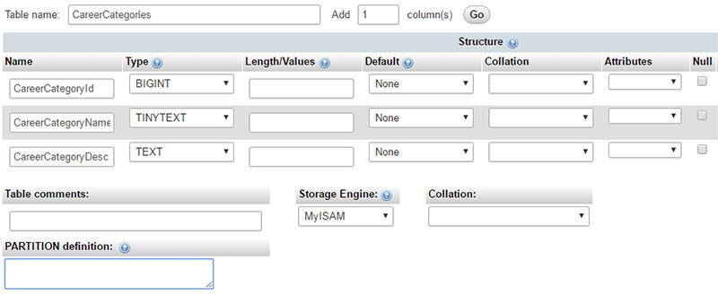 How To Create a New Table in MySQLUse phpMyAdmin, which will usually be provided by your hosting provider. Use the create table fields which appear at the bottom of the phpMyAdmin home page, as shown below, and click on the Go button.