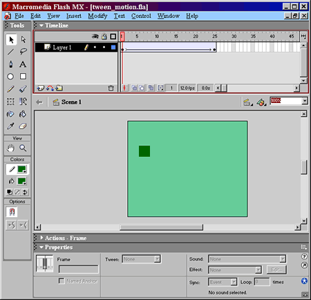 Flash Motion Tween TutorialFlash tutorial on how to create a motion tween, created Aug 2006. - With playhead on frame one, draw rectangle. - Click on frame 25, right click and select Insert Keyframe. - Click on Arrow Tool and Drag rectangle across screen. - Right click on frame 25, select Create Motion Tween. - Right click on any frame between 1 and 25, and select Create Motion Tween. Tween arrow will appear.