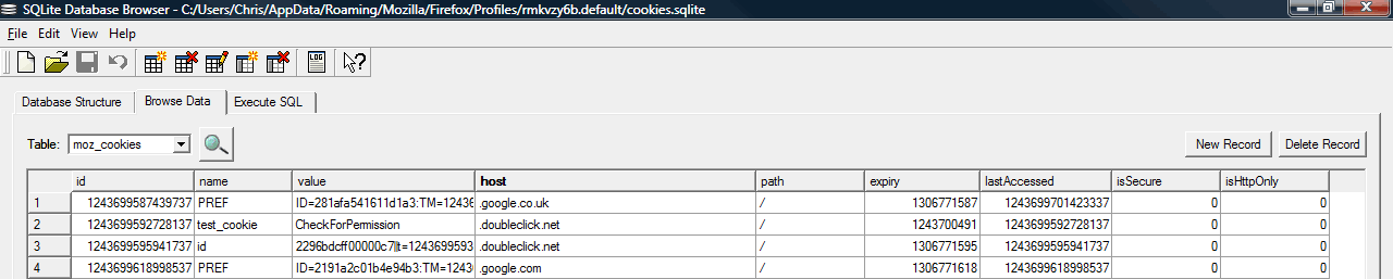Location of Firefox 3 Cookies in Windows Vista Home PremiumWe were using Firefox 3.0.10 and Windows Vista Home Premium 32-bit and wanted to take a look at the data contained in the Firefox cookies. We found the cookies were saved at the following location: c:/Users/OurUsername/AppData/Roaming/Mozilla/Firefox/Profiles/rmkvzy6b.default We needed to download and install the SQLite Database Browser to view the contents of our cookies, see sample image.