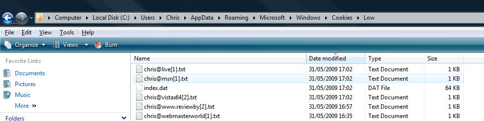 Location of IE7 Cookies in Windows VistaWhere can you find the cookies generated by IE7 on Windows Vista? Well, we found them at: c:/Users/OurUsername/AppData/Roaming/Microsoft/Windows/Cookies/ and c:/Users/OurUsername/AppData/Roaming/Microsoft/Windows/Cookies/Low Here's a sample image of the IE7 Cookies in Windows Explorer. If you can't see the cookie folders, it may be that you need to change your Folder Options in Windows Explorer so that hidden system files are displayed, and there's more on this at: http://www.vistax64.com/tutorials/84215-folder-options.html